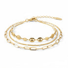 Elevate your look with the Triple Layered Luxe Anklet. Crafted with 14K gold plating, three distinct chains create a layered statement piece that's both delicate and bold. Its adjustable length (9"–11") ensures a perfect fit, while hypoallergenic and tarnish-resistant properties make it ideal for everyday wear.