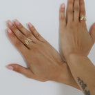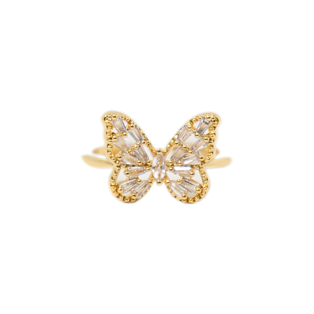 Glistening gemstones form the wings of the small mariposa on this adjustable gold ring.