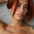 The Bow Necklace in silver delicately embraces the neck with an adjustable choker fit and a charming bow adornment.